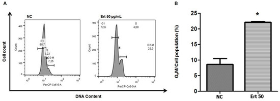 (A) Flow cytometric of cell cycle analysis of SiHa cells treated with isolated erythraline (Ert) or control (NC); (B) comparison of G2/M cell count in Ert-treated group and NC. * p < 0.05.