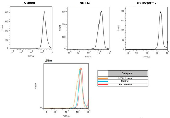Analysis of mitochondrial membrane potential in SiHa cells after treatment with erythraline (Ert) 100 μg/mL, cisplatin (CDDP) 15 μg/mL, and control for 24 h. The mitochondrial membrane potential was measured using Rhodamine 123 (Rh-123) and analyzed by flow cytometry.