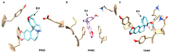 Computational model of the target binding interaction of the erythraline alkaloid (Ert) and the proteins (A) Polyamine Oxidation (PAO), (B) Pyruvate Kinase M2 (PKM2), and (C) Tankyrase (TANK).
