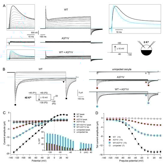 Under two-electrode voltage clamp in 5 K+, depolarizing pulses from a holding potential of −80 mV to test potentials between −80 and +60 mV elicited typical outward currents in oocytes expressing WT Kv12.2 channels (Figure 1A). With moderate depolarizations, the currents showed slow activation and no macroscopic inactivation, but, with stronger depolarizations (above 0 mV), a transient current component emerged, and the residual current at the end of the test pulse decreased due to the occurrence of voltage-dependent inactivation (Figure 1A, upper panels; Supplementary Figure S2B; [,]). Upon hyperpolarization to −100 mV, typical biphasic inward tail currents were recorded, reflecting the passage of channels through the open state during recovery from inactivation before they closed (Figure 1A, upper panels [,]). Neither such typical outward currents during depolarizing test pulses, nor such typical inward tail currents at −100 mV were recorded in 5 K+ from oocytes expressing only the A371V mutant, also compatible with a complete LoF (Figure 1A, middle panels; Supplementary Figure S2B). However, the co-expression of WT + A371V did result in typical outward and inward currents, and the current amplitudes were disproportionately small (Figure 1A, lower panels; Supplementary Figure S2B,C), indicative of WT + A371V co-assembly with a dominant-negative effect of the mutant, as stated earlier []. Moreover, the present data confirm the previously reported different degrees of suppression for the peak and the sustained current component (Supplementary Figure S2C; []). Intriguingly, the peak outward currents mediated by heteromeric WT + A371V Kv12.2 channels exhibited accelerated decay kinetics in comparison to homomeric WT Kv12.2 channels (Figure 1A, upper right). Thus, instead of being completely non-functional, A371V mutant α-subunits may induce Kv12.2 channel modulation involving an altered voltage dependence of gating and/or altered kinetics of inactivation.