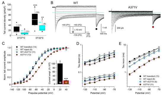 Functional expression of WT and mutant Kv12.2 channels in CHO cells is enhanced by reduced culture temperature enabling biophysical analysis of the LoF mutant. (A) Distributions of current densities obtained with two culture conditions (37/37 °C or 37/32 °C) are given as boxplots for WT data (black) and WT + A371V co-expression data (cyan). Electrophysiological experiments were performed 48–60 h after transfecting CHO cells either with WT Kv12.2 channel cDNA alone or with a 1:1 ratio of WT + A371V cDNA, yielding the same total amount of channel cDNA. Part of the glass plates with transfected cells had been transferred to an incubator with a reduced temperature of 32 °C, 20 h after the transfection procedure. Membrane currents were recorded in 40 K+ external solution with an availability protocol as shown in (B). Tail current amplitudes at −100 mV were obtained from Boltzmann fits to tail current–prepulse voltage relationships. Tail current density was calculated by dividing the current amplitude by the cell capacitance. Number of experiments given in brackets. Black asterisks indicate a significant difference for reduced culture temperature compared to continuous maintenance at 37 °C; cyan asterisks indicate a significant difference between co-expression data and WT data obtained under the same culture condition. ** p < 0.01, *** p < 0.001; Mann–Whitney U test. (B) Membrane currents recorded in CHO cells in 40 K+ external solution with the indicated availability protocol three days (37/32/32 °C) after transfection with WT or A371V Kv12.2 cDNA. The holding potential was −30 mV; note the differing current scales. Horizontal lines indicate zero current. (C) Normalized tail current amplitudes (means ± SEM) during the final constant pulse to −100 mV are plotted against the preceding variable test pulse potential; prior to averaging, data of individual experiments were normalized using the amplitude of Boltzmann fits to the data points. The black and red lines show Boltzmann fits to the mean normalized data for WT (black) and A371V (red) from transfection experiments. In addition, results from co-expression experiments are given, where single CHO cells were microinjected with WT Kv12.2 cDNA alone as control or with WT + A371V cDNA resulting in a twofold concentration of total channel cDNA. Injected cells were used for recordings two days after injection (32/32 °C). The inset bar plot shows WT and A371V tail current amplitudes (means ± SEM) from the transfection experiments, normalized to the mean WT current amplitude. Number of experiments given in parentheses or at the bottom of the bars. *** p < 0.001; unpaired t-test. (D,E) The time course of current traces elicited with test pulses to more negative potentials was fitted with the sum of three exponential functions describing the bi-exponential current decay, yielding a fast (circles) and a slow (squares) time constant of deactivation (D), as well as the initial current increase, yielding the time constant of recovery from inactivation (E). Color code of symbols and number of experiments given in (E) also apply for panel (D). Results of statistical analyses of time constants are given in Supplementary Table S1.