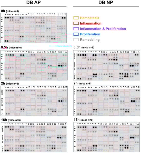Cytokine expression in diabetic wound healing. Cytokine expression profiles in type 2 diabetic mouse model at four-time points: 0, 0.5, 2, and 16 h after wounding under two pressure conditions: AP and NP. Color frames indicate wound healing stages (early to late): hemostasis (orange), inflammation (red), inflammation and proliferation (purple), proliferation (blue), and remodeling (grey). Rows A through J represent cytokine target spots based on the predefined array layout of the Mouse XL Cytokine Array (R&D Systems). For details on spot assignments and cytokine identities, please refer to the product documentation provided by the manufacturer.