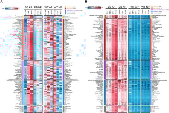 When the diabetic mice treated with AP were used as the baseline for comparison, and the results from previously published WT mice were included, an interesting pattern emerged (Figure 3A). In the comparison between diabetic AP and diabetic NP, NPWT consistently suppressed the expression of almost all cytokines, a stark contrast to the results previously observed in WT mice.