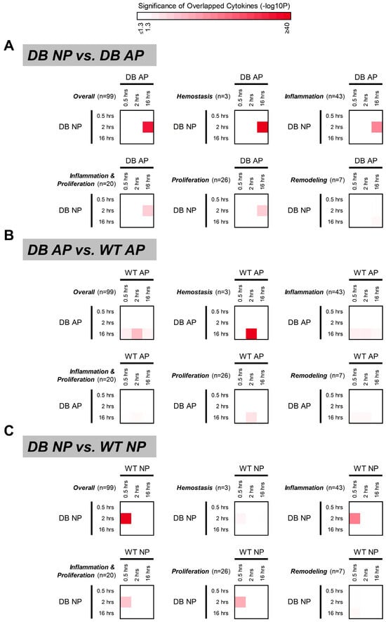 Concordance in peak cytokine expression. This analysis investigates whether similar sets of cytokines (overall/stage-specific) show peak expression at varying time points (0.5, 2, and 16 h) across different groups (genotype/pressure) following wounding. (A) Overlap in cytokines peaking at 2 h (NP) and 16 h (AP) suggests NP promotes early healing through similar cytokine regulation in diabetic mice. (B,C) Overlap in cytokines between genotypes suggests similar sets are involved in responses to AP (WT: 2 h vs. diabetic: 16 h) and NP (WT: 0.5 h vs. diabetic: 2 h), with WT mice exhibiting faster peak expression. Color gradient (log10 p-value): Darker red indicates stronger concordance (more significant overlap) in peak cytokines (binomial test; see Methods for details); white: not-significant (p ≥ 0.05). n = number of cytokine genes.
