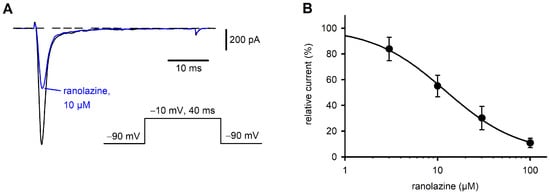The application of 10 µM of ranolazine reduced the Nav1.7 current amplitudes by about 50% (Figure 1A). The effect occurred within several seconds and was reversible upon washout. The block of the Nav1.7 channel was dependent on the applied ranolazine concentration (Figure 1B). The calculated concentration required for half maximal inhibition (12.1 µM) agrees with previous results [,].