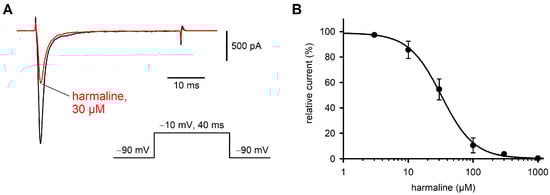 In contrast to the mechanism of block of Ca2+ channels by harmaline, we did not observe a state-dependent block of Nav1.7 channels. Neither the current/voltage curves of the Na+ currents nor the steady-state inactivation curves were shifted by harmaline. Half maximum inhibition of whole-cell Nav1.7 currents was achieved without significant shifts in the mentioned curves on the voltage axis (Figure 3). Many Na+ channel-blocking substances, such as drugs and toxins [], exert their effects by shifting the inactivation curve to more negative potentials or shifting the activation to more positive potentials []. Both effects can reduce cellular excitability and preferentially reduce late currents. For harmaline, we observed a nearly identical inhibition of both peak and late currents (Figure 4B). Taken together, the mechanism of harmaline action on the Nav1.7 channel resembles that of substances occluding the channel pore [] without noticeable voltage dependence of the block, at least as derived from this initial study.