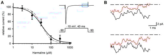 Effect of harmaline on Nav1.7 late currents recorded from CHO cells. From a holding potential of −90 mV, the membrane was depolarized to −10 mV for 40 ms at a stimulation frequency of 1 Hz. The last 5 ms of TTX-sensitive currents were analyzed for Nalate; see inset in (A), blue box. (A) Harmaline, at concentrations ranging from 3 µM to 1 mM, was continuously perfused until a steady state was obtained. Then, 1 µM of TTX was applied and remaining nonspecific currents were subtracted offline. Relative currents were plotted against harmaline concentration, a sigmoid curve was fitted to the data points (black line) and an IC50 of 31.13 µM was calculated. Data points are given as means ± SD. For comparison, the concentration/response curve for inhibition of peak currents is superimposed (dashed grey line, see Figure 2B). (B) Representative TTX-sensitive inward currents (last five ms of original recordings, see inset in (A), blue box) at −10 mV under control conditions (black) and after perfusion with 30 µM of harmaline (red). Dashed line is the base line at 0 pA.