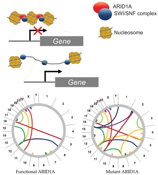 ARID1A (BAF250a or SMARCF1) is a member of the SWI/SNF (BAF) protein complex and is responsible for DNA binding. This protein complex regulates chromatin structure by binding nucleosomes and facilitating the unwinding or compaction of chromatin. Dysregulation of the complex can open the chromatin to aberrant gene transcription and chromosomal rearrangements (Figure 1) [1]. However, due to the multiple protein binding domains found throughout the protein, its function is not restricted to the SWI/SNF complex [2]. Mutations that result in loss of ARID1A have been shown to contribute to faster tumorigenesis, progression towards metastasis, and development of chemoresistance across several cancers including ovarian, colon, osteosarcoma, and esophageal cancer [2,3,4,5,6,7,8,9]. As an important tumor suppressor, it is essential to understand the mechanisms whereby ARID1A loss promotes various stages of cancer development. ARID1A is not only involved in various stages of cancer development but contributes to this through multiple hallmarks of cancer [10,11,12]. In this review, we explore the more recent evidence suggesting that ARID1A loss contributes to notable cancer hallmarks such as genomic instability, cell cycle regulation, EMT and dedifferentiation, immune evasion, and evading cell death across various cancer types. First, we present the correlation of pathogenic variants in the most impacted cancer types.