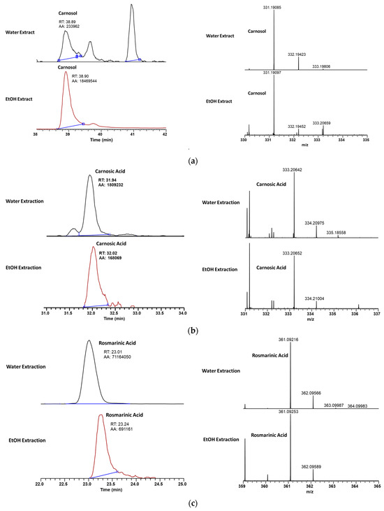 Comparative LC-MS analysis of carnosol (a), carnosic acid (b), and rosmarinic acid (c) in water and ethanol extracts of rosemary leaves.