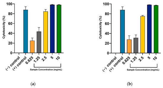 Concentration-dependent cytotoxicity of rosemary leaf extracts on DU-145 after a 24-h treatment period: (a) water extract (RL-W) and (b) ethanol extract (RL-E). The positive (+) control is 1 mg/mL 5-FU, while the negative (−) control includes only the media. These results are expressed as mean ± standard deviation. Sample concentration and solvent interaction were significantly different based on the two-way ANOVA analysis. Additionally, it was revealed that treatment with varying sample concentrations and solvent extracts causes significant sources of variation in the resulting cytotoxic effects of the plant extract.