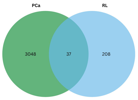 Primary active metabolites (COH, CA, and RA) found in rosemary leaf extracts using water and ethanol solvent systems were obtained from the existing literature [29,35,36,37,38,39,40]. The over-expressed and under-expressed prostate adenocarcinoma (PRAD) genes and differentially expressed genes (GSE179324) versus normal prostate cells for the DU-145 cell line were identified. Figure 4 shows that the total number of shared genes between significant rosemary metabolites in leaf extracts and PCa target genes is 37.
