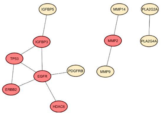 A protein–protein interaction (PPI) network was constructed in Figure S1 using these overlapping genes with an interaction score of 0.4 in STRING. An increase in the minimum required interaction score of 0.9 (highest confidence) gave network statistics reporting a PPI enrichment p-value of 3.88 × 10−4 with 28 connected components. This result suggests that the target proteins interact more with themselves than expected. Centrality analysis and evaluation were performed considering BC, CC, MCC, DMNC, and DC metrics to identify essential proteins for use as key targets to evaluate the potency of selected RL metabolites against PCa. Figure 5 exhibits a constructed PPI network with the top six proteins resulting from the analysis with an interaction score of 0.9. The target genes were epidermal growth factor receptor (EGFR), tumor protein p53 (TP53), insulin-like growth factor-binding protein 3 (IGFBP3), receptor tyrosine-protein kinase erbB-2 (ERBB2), matrix metalloproteinase-2 (MMP-2), and histone deacetylase 6 (HDAC6).