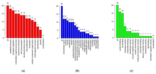 Gene Ontology slim summaries for (a) BP, (b) CC, and (c) MF.