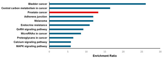 Bar chart of the top enriched terms for the KEGG pathway based on the enrichment ratio. The red-colored indicates the enrichment ratio of PCa.