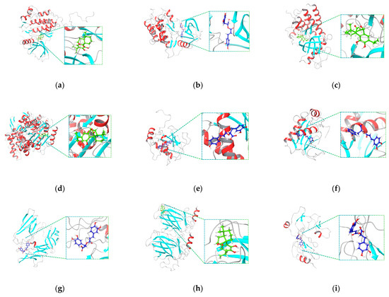 Representative protein–ligand complexes with ligands bound in the active site of nine target proteins. The protein is shown using a ribbon representation, and the ligand is displayed in the ball-and-stick model. For each protein, only the complex with the most negative binding energy for the respective ligand is presented. Insets provide a magnified view of the ligand within the binding site. Panels correspond to the following complexes: (a) EGFR (PDB ID: 1M17)–COH, (b) ERBB2 (PDB ID:3PP0)–RA, (c) FGFR1 (PDB ID: 7WCL)–COH, (d) HDAC6 (PDB ID: 5EDU)–COH, (e) MMP-2 (PDB ID: 1HOV)–RA, (f) MMP-9 (PDB ID: 1GKC)–RA, (g) PDGFRB (PDB ID: 3MJG)–RA, (h) TP53 (PDB ID: 2VUK)–COH, and (i) IGFBP3 (PDB ID: 7WRQ).