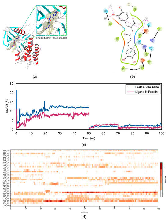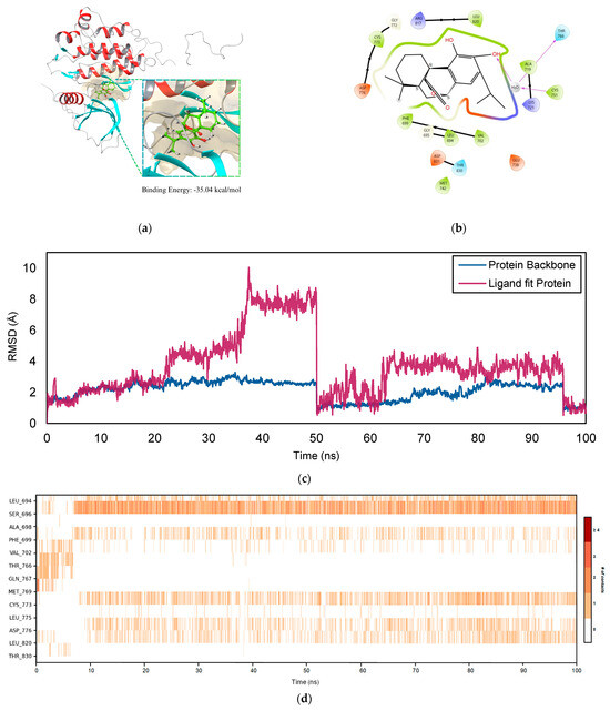 ERBB2–RA complex. (a) Docking pose of the ligand within the protein binding site with the calculated MM-GBSA binding energy reported in kcal/mol. (b) Two-dimensional interaction diagram illustrating detailed protein–ligand contacts. The stereochemical configuration with chiral centers assigned as (S) and (R) and double bonds designated as (E) and (Z). (c) RMSD plot of the protein–ligand complex over the 100 ns MD simulation, indicating structural stability. (d) Chronological map of protein–ligand contacts over the 100 ns MD simulation, depicting the persistence and dynamics of specific residue interactions throughout the trajectory. Residue contact frequency is represented by color, with darker shades of orange on the scale to the right indicating more frequent interactions.