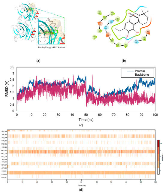Figure 11d displays the chronological order map of protein–ligand contacts for the TP53–COH complex over 100 ns. Based on the figure, consistent and steady ligand–residue contacts occurred during the MD simulation. These residues were mainly SER 227, THR 230, PRO 223, and VAL 147. Among these residues, THR 230 has been reported to have the most frequent contact with the ligand through hydrogen bonding, which helps to anchor the ligand in the binding site. Aside from this, residue PRO 223 showed persistent contact via a combination of hydrophobic contacts, water bridges, and ionic interactions. These interactions contribute to the stability of the complex due to the steady contacts over 100 ns as the ligand remains tightly bound, which is reflected in a low and consistent RMSD profile.