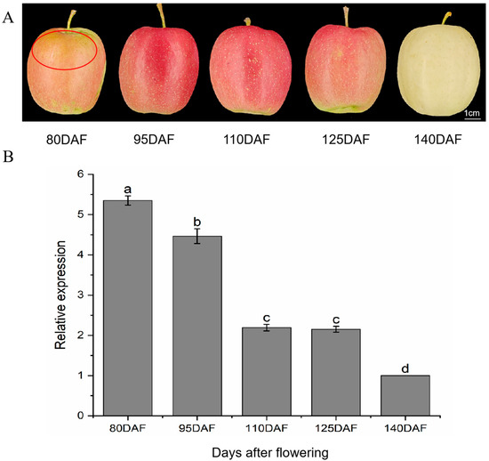 Changes in apple surface appearance and MdANR expression levels at different harvesting stages. (A) Phenotypic changes in bagged apple fruits at different days after flowering (DAF). (B) Expression levels of MdANR in pericarp at corresponding time points. Different letters indicate statistically significant differences across indicated DAF (p < 0.05).