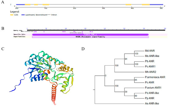 Bioinformatics analysis of MdANR. (A) Intron–exon structure of MdANR gene. (B) Predicted conserved domain of MdANR protein. (C) Predicted secondary structure of MdANR protein. (D) Phylogenetic tree of ANR in Malus domestica and other tree species. Sequences included in analysis are from Malus domestica (Md) ANR, Malus sylvestris (Ms) ANR-like, Pyrus bretschneideri (Pb) ANR, Pyrus communis (Pc) ANR1, Malus hybrid (Mh) ANR2, Prunus avium (P. avium) ANR1, Prunus dulcis (Pd) ANR-like, Prunus persica (Pp) ANR, Prunus armeniaca (P. armeniaca) ANR, Actinidia eriantha (Ae) ANR-like, and Prunus cerasus (Pc) ANR.