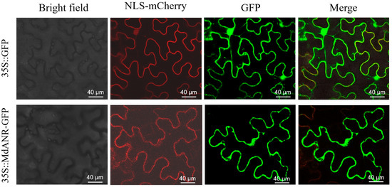 The subcellular localization of MdANR. The empty vector (35S::GFP) was used as a control. Nuclear staining was performed using mCherry. GFP represents green fluorescent protein, whereas the merged image shows the overlap of the GFP and mCherry signals, indicating colocalization.