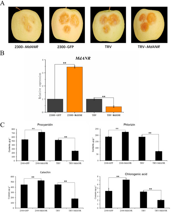 Transient expression of MdANR in apple fruit. (A) Phenotypic changes in apple peel following transient transformation. (B) Relative expression levels of MdANR in apple peel. (C) Changes in metabolite content in apple peel. Data presented as mean ± standard deviation, and ** indicates statistically significant difference (p < 0.01).