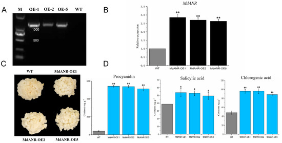 To further validate the function of MdANR, stable transformation was performed in apple callus using Agrobacterium carrying the MdANR overexpression vector. Transgenic apple callus lines with MdANR overexpression (OE-1, OE-2, and OE-5) were successfully generated (Figure 5). PCR analysis confirmed the presence of the transgene in the overexpression lines, as indicated by the appearance of white bands in the transgenic samples (Figure 5A). RT-qPCR analysis further demonstrated significantly higher MdANR expression levels in transgenic callus compared with the WT control (Figure 5B), confirming stable gene expression. Following high-temperature and strong-light treatment, phenotypic differences were observed between the WT and transgenic calli. WT callus exhibited more pronounced browning than transgenic callus, suggesting that MdANR overexpression enhances stress resistance (Figure 5C). Metabolite analysis revealed significant increases in procyanidin (PA), salicylic acid, and chlorogenic acid levels in transgenic callus lines, with concentrations 11.78, 1.37, and 1.96 times higher than those in the WT callus, respectively (Figure 5D). These results indicate that MdANR overexpression promotes the accumulation of PAs and other stress-related metabolites in apple callus.