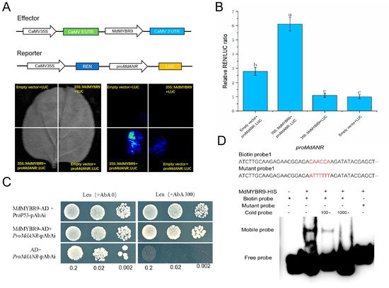 To determine whether MdANR is directly regulated by the upstream transcription factor MdMYBR9, a series of molecular assays, including a dual-luciferase reporter assay, yeast one-hybrid (Y1H) assay, and EMSA, were conducted. The MdANR promoter was cloned into the pGreen II 0800-LUC vector, whereas the CDS of MdMYBR9 was inserted into the pGreen II 62-SK vector. When 35S::MdMYBR9 and proMdANR::LUC were co-infiltrated into tobacco leaves, LUC activity was significantly elevated, indicating that MdMYBR9 activated the MdANR promoter (Figure 6A). The dual-luciferase assay substantiated these findings, as the LUC/REN ratio demonstrated that MdMYBR9 significantly upregulated MdANR promoter activity (Figure 6B). For the Y1H assay, the MdANR promoter was inserted into the pAbAi vector, whereas MdMYBR9 was cloned into the pGADT7 vector to generate the MdMYBR9-AD recombinant construct. This construct was introduced into yeast strains containing MdANR-pAbAi. Yeast cells harboring both MdMYBR9-AD and MdANR-pAbAi grew on selection medium containing 300 ng/mL AbA, whereas those containing MdANR-pAbAi alone or the AD empty vector failed to grow, confirming that MdMYBR9 binds directly to the MdANR promoter (Figure 6C). The EMSA results provided further evidence of this interaction. No gel shift was observed when the biotin-labeled probe was added alone. However, after incubation with the MdMYBR9 protein, a clear shift was detected, indicating binding. The addition of an unlabeled cold probe reduced the intensity of the binding signal, whereas no shift was observed when a mutant probe was used (Figure 6D). Collectively, these results confirm that MdMYBR9 directly binds to the MdANR promoter, activates its transcription, and promotes MdANR expression.