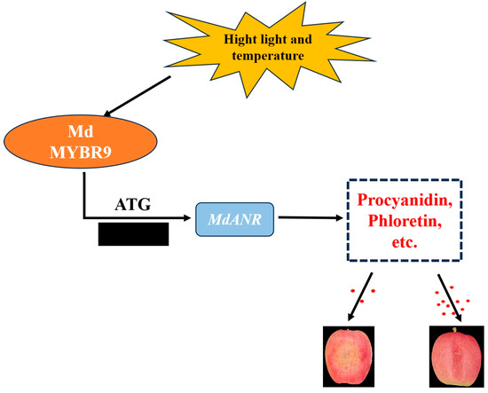 Extensive research has explored the regulation of ANR by transcription factors, including MYB, NAC, and WD40. Studies suggest that ANR is directly regulated by MYB transcription factors, whereas other transcription factors exert indirect regulatory effects [34]. In rose petals, RhMYB1 activates RhMYB123 by binding to its promoter, and both proteins cooperatively promote PA biosynthesis by binding to the promoters of ANR and LAR genes [35]. Similarly, in walnut, JrMYB12 and JrbHLH42 interact to form a complex that significantly enhances the promoter activity of JrLAR and JrANR in PA biosynthesis, either independently or in combination [36]. In apple, the MdERF1B transcription factor activates MdMYB, which, in turn, regulates PA biosynthesis and enhances antioxidant capacity [37]. Under low-temperature stress, MdMYB23 directly binds to the MdANR promoter, activating its expression, promoting PA accumulation, and enhancing ROS scavenging [23]. Additionally, the overexpression of MdMYB9 and MdMYB11 in apple callus under MeJA treatment led to the upregulation of MdANS and MdANR expression, resulting in the increased accumulation of anthocyanins and PAs [38]. In this study, a Y1H assay, dual-luciferase reporter assay, and EMSA collectively demonstrated that MdMYBR9 binds directly to the MdANR promoter and activates its transcription under high-temperature and strong-light-intensity stress (Figure 6); the study is the first to investigate MdMYBR9-MdANR interaction under high-temperature and -light stress. Based on these findings, we propose a new regulatory model in which MdMYBR9 enhances apple peel resistance to sunburn by activating MdANR expression, thereby promoting PA biosynthesis. Overall, we report the MdMYBR9-MdANR-PAs regulatory pathway as a key mechanism in mitigating apple peel sunburn (Figure 7).