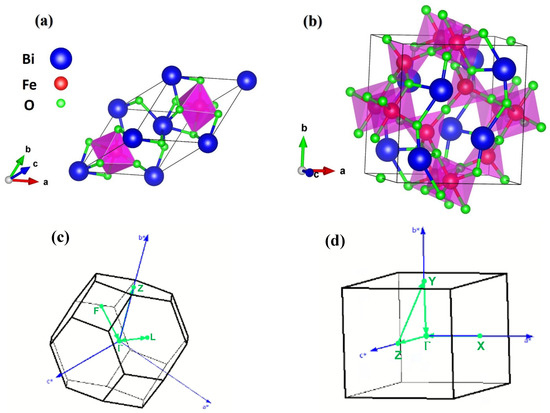 At ambient conditions, BiFeO3 crystallizes in a rhombohedral distorted perovskite structure (R3c space group), as illustrated in Figure 1a, whereas Bi2Fe4O9, adopts an orthorhombic structure (Pbam space group), as shown in Figure 1b. The optimized lattice parameters of these systems are presented in Table 1. Fe and O in the crystal structure, which is made up of a F e 4 + O 6 2 octahedral and F e 3 + O 4 2 tetrahedral. Fe, Bi, and O atoms have the following valence states: Fe (3p63d64s2), Bi (5d106s26p3) and O (2s22p4). The band structures of BiFeO3 and Bi2Fe4O9 are calculated along high-symmetry directions (F–Γ–L–Γ–Z) and (X–Γ–Z–Y–Γ), respectively, in the Brillouin zones (refer to Figure 1c,d for notation).
