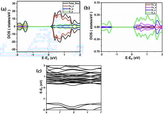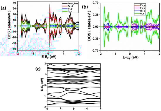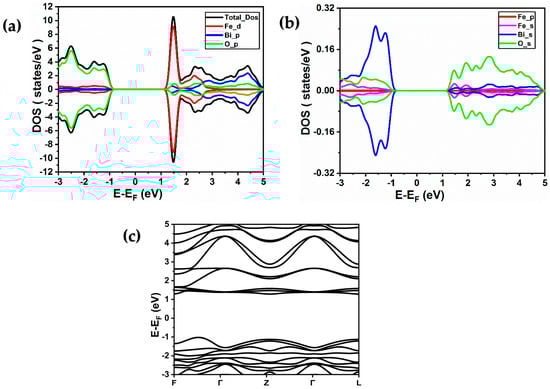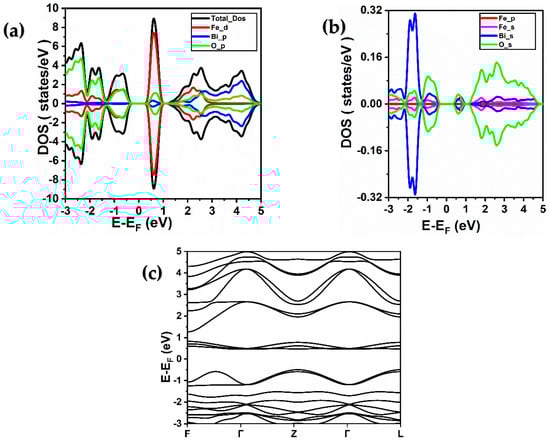 Figure 5. (a,b) Total and partial spin-resolved densities of states of Bi2Fe4O9 calculated using PBE-GGA + U (4 eV) approximation. (Fe (d), Fe (p), and Fe (s) denote the 3d, 3p, and 4s orbitals of iron, respectively, while Bi (p) and Bi (s) represent the 6p and 6s orbitals of bismuth, respectively, and O (p) and O (s) signify the 2p and 2s orbitals of oxygen, respectively). (c) Band structure of BiFeO3 material obtained using PBE-GGA + U (4 eV) approximation.