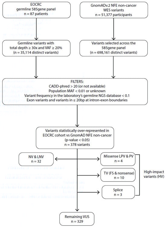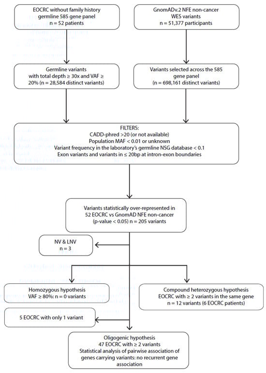 Early-onset colorectal cancer (EOCRC) is a rare disease, characterized by late diagnosis/late-stage disease and left-sided primary tumors [,,,]. EOCRC is more prevalent in men and associated with a family history of colorectal cancer (CRC), inflammatory bowel disease, alcohol and tobacco use, a sedentary lifestyle, and obesity (body mass index ≥ 30) [,]. It is generally accepted that 5–10% of familial CRCs are caused by a genetic predisposition transmitted by a Mendelian pattern of inheritance, as Lynch syndrome and familial polyposis syndromes []. A French consensus colorectal gene panel (DIGE panel) [] is therefore routinely used identifying germline pathogenic (PV) or likely pathogenic (LPV) variants or copy number variants (CNV, deletions or duplications) in 20% of EOCRC cases. Multi-gene testing [,,,], or whole exome sequencing (WES) [,,,,,,], have been used to identify candidate genes for EOCRC risk. However, these studies have either tested small gene panels in large patient cohorts based on relatively non-selective inclusion criteria [,,] or performed large molecular analyses (WES) on smaller cohorts (between 16 and 51 patients) [,,,].