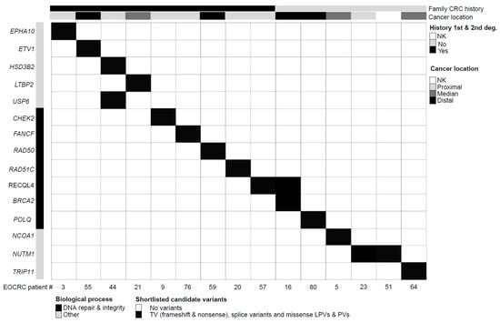 In the EOCRC cohort (n = 87), we identified 15 EOCRC patients carrying statistically over-represented HVs (p < 0.05). Nine of them, presenting a family history of CRC, carried HVs in 10 distinct genes (Figure 2 and Table 2), including genes involved in DNA repair pathways (CHEK2, FANCF, RAD50, and RAD51C) and DNA integrity (RECQL4). Among these patients, EOCRC#09 (CHEK2 variant) had a maternal family history of breast and pancreatic cancer (2nd- and 3rd-degree relatives). His maternal grandmother was diagnosed with both CRC and breast cancer at 65 years of age. CHEK2 germline PVs/LPVs are considered as moderate-risk factors for breast cancer. Patient EOCRC#57 (RECQL4 variant) presented with a mucinous adenocarcinoma of the ascending colon at the age of 32 and her father was diagnosed with CRC at the age of 64. EOCRC#57 was heterozygous for the RECQL4 PV (no evidence of compound heterozygosity) and did not exhibit any syndrome features of RECQL4-associated recessive syndromes as Rothmund–Thomson (RTS, MIM #268400), RAPADILINO (MIM #266280) and Baller–Gerold (BGS, MIM #218600)) []. The remaining HVs in the EOCRCs with a family CRC history mapped to genes involved in steroid biosynthesis (HSD3B2), transcription regulation (ETV1), and other cellular pathways (EPHA10, LTBP2, and USP6). Patient EOCRC#44 who carries HVs in both HSB3B2 and USP6 genes presented with adenocarcinoma of the ascending colon at the age of 36 and his father was reported with CRC (unknown age at diagnosis).