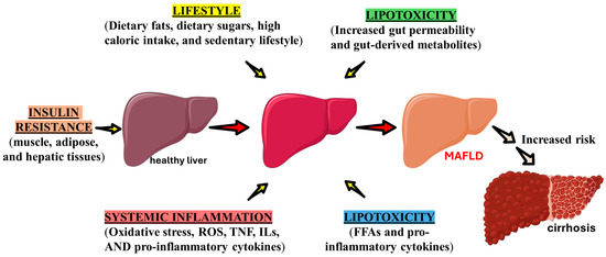 MAFLD presents a heterogeneous pathophysiology initially described through the “two-hit hypothesis”, which considers hepatic steatosis as the first significant damage induced by insulin resistance, while oxidative stress represents the second hit, exacerbating inflammation. Fibrosis is also affected in the long term due to this process. This hypothesis has been replaced by a more complex, multifactorial model known as “multiple hits”, in which various factors act simultaneously. Chronic inflammation, along with oxidative stress, contributes to insulin resistance. Pro-inflammatory mediators such as leptin, resistin, IL-6, TNF-α, and intestinal bacterial endotoxins interfere with insulin signaling, impairing glucose uptake in peripheral tissues [47,48,49]. Additionally, oxidative stress resulting from the accumulation of fatty acids in the liver contributes to mitochondrial dysfunction and the activation of pro-inflammatory signaling pathways, thereby increasing insulin resistance. Chronic inflammation is crucial for the progression of MAFLD, with the activation of inflammatory pathways and an imbalance of pro-inflammatory and anti-inflammatory adipokines contributing to the transition from simple hepatic steatosis to more severe forms of the disease [50,51,52,53]. Moreover, genetic polymorphisms in the PNPLA3 and TM6SF2 genes are linked to the development of MAFLD. These variants positively favor the accumulation of glycerides in the hepatocyte and increase the likelihood of fibrosis severity. While polymorphisms in PNPLA3 are related to increased lipids, TM6SF2 E167K is related to the reduced secretion of VLDL, leading to greater fat accumulation [54].