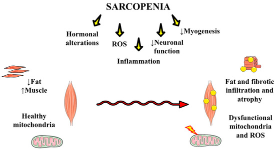 In addition, when examining the pathophysiology of sarcopenia, it is important to understand the association between mitochondrial dysfunction and the inflammatory processes previously elucidated. In muscle homeostasis, mitochondria play several roles, such as the self-digestion of internal components, the control of programmed cell death, and the production of ROS, which can also be added to functions related to protein control. Thus, mitochondrial dysfunction corresponds to an important mechanism of skeletal muscle degradation and the development of sarcopenia [145,146,147,148].