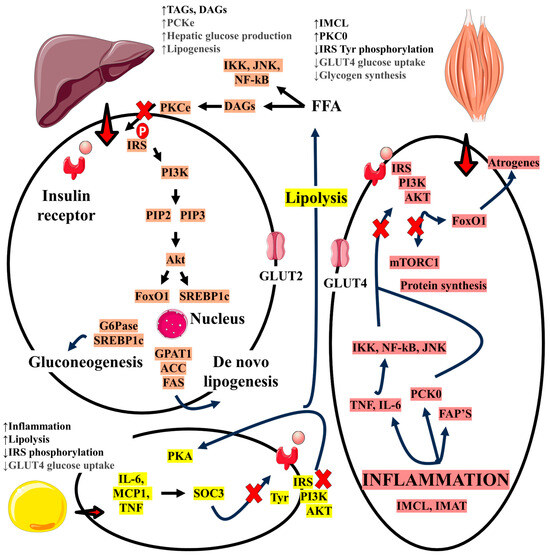 Upon binding to its receptor, insulin induces an increase in tyrosine kinase activity, followed by the phosphorylation of tyrosine residues on the insulin receptor substrate (IRS). Once phosphorylated by tyrosine, IRS binds to phosphatidylinositol 3-kinase (PI3K) and activates it, leading to the formation of phosphatidylinositol 3,4,5-trisphosphate (PIP3) at the plasma membrane. The 3′-phosphoinositide-dependent kinase 1 (PDK1) is then activated by binding its pleckstrin homology (PH) domain to PIP3, which in turn activates the protein kinase AKT through the phosphorylation of a threonine residue. AKT subsequently targets various molecules, including forkhead box O1 (FoxO1), mechanistic target of rapamycin (mTOR), and glucose transporter 4 (GLUT4). Insulin resistance refers to the diminished sensitivity of target tissues to insulin stimulation. Several factors contribute to insulin resistance, including defects in the insulin signaling cascade, the inhibition of the cascade through pro-inflammatory pathways, and even insulin resistance induced by fatty acids due to lipid accumulation in the liver and muscles [19,151,152,153].