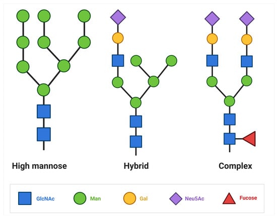 Type of N-glycans: In high-mannose N-glycans, the core oligosaccharide sequence extends only mannose residues; in hybrid glycans, one extension contains GlcNAc structures and the other has mannose; in complex glycans, both extensions contain GlcNac structures.