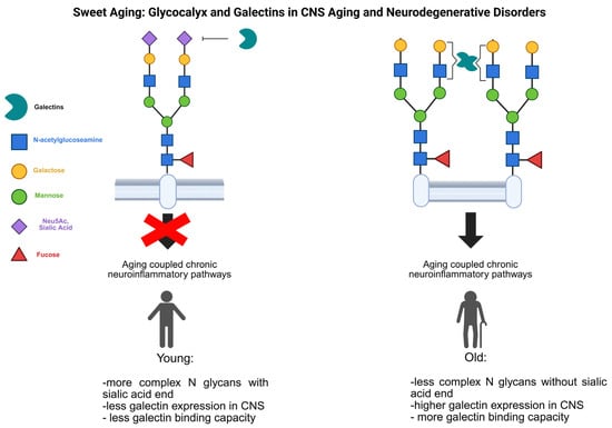 Beneath the sialylated ends of glycosylated proteins lie N-acetyl-lactosamine structures, which are recognized by galectins. During aging, serum levels of inflammation-linked galectin-3 increase, underscoring their role in aging-related inflammation []. Within the CNS, aging alters lectin-like molecules, with increasing levels of galectin-1-expressing microglial populations in aged rodent brains. These microglia exhibit an activated morphology [].