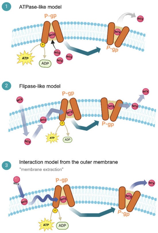 Proposed mechanisms of P-gp-mediated drug efflux. Three primary models have been proposed to explain P-gp-mediated drug efflux: (1) direct extraction, where P-gp directly extracts substrates from the cytoplasm; (2) flippase activity, where P-gp transports substrates from the inner to the outer leaflet of the plasma membrane; and (3) membrane extraction, where P-gp directly removes substrates from the outer leaflet of the membrane. Created in BioRender by Alvarez-Carrasco, P. https://BioRender.com/m52w661 accessed on 14 January 2025.