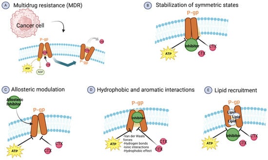 P-gp recognizes and binds to its substrates through weak electrostatic interactions, such as hydrogen bonding, π-π stacking, and π-cation interactions (Figure 2) [17]. The binding affinity of drugs to P-gp is influenced by their molecular size and the number and type of hydrogen bond acceptor groups they possess. Also, this protein can simultaneously bind to multiple drug molecules, which can lead to the inhibition or induction of its activity, depending on the specific compounds involved [13].