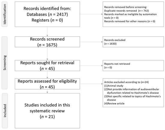 The exclusion criteria were the following: (a) articles not recruiting patients with Hashimoto’s disease; (b) articles not related to the characteristics, pathophysiology, examination, or treatment related to audiovestibular dysfunction in patients with Hashimoto’s disease; and (c) animal studies. Review articles were chosen to manually extract articles from their reference list. The excluded articles are listed in Table S3.