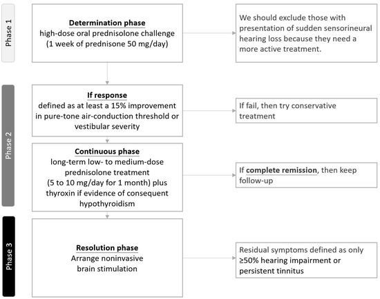 We conducted a three-phase trial. In phase 1, patients underwent a high-dose oral prednisolone trial (1 week of prednisolone 50 mg/d) to determine their response to steroid treatment. Response was defined as at least 15% improvement in the pure-tone air-conduction threshold or vestibular symptom severity (according to any vestibular symptom severity rating scale). Following phase 1, patients began long-term low- to medium-dose prednisolone treatment (5–10 mg/d for 1 month) in phase 2. Furthermore, in phase 2, thyroxine is added depending on the presence or absence of consequent hypothyroidism, which differs from other autoimmune inner ear diseases. Finally, in phase 3, patients with residual symptoms (≥50% hearing impairment or persistent tinnitus) undergo audiovestibular dysfunction-specific noninvasive brain stimulation [60,61].