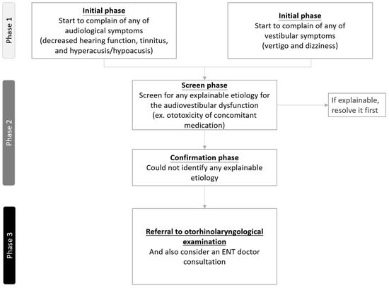 Although there is no consensus regarding the red flags or timing of referral for otorhinolaryngological examination, we have summarized some potential time points for referral consideration based on our previous report and clinical practice experience [4]. First, patients complain of audiological symptoms, such as decreased hearing function, tinnitus, or hyperacusis/hypoacusis. Second, patients report unexplained vestibular symptoms, such as vertigo and dizziness. Third, clinicians should consider ENT referral if a patient’s audiovestibular symptoms are unlikely to be related to the ototoxicity of a prescribed medication. Finally, although subjective, clinicians should consider ENT referral if they notice that their clinical advice is frequently ignored by a specific patient. A detailed flowchart of the referral process is shown in Figure 4.