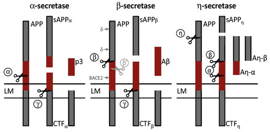 The processing mechanisms for amyloid precursor protein (APP) are represented schematically. Aβ, Aη-α, and Aη-β are abbreviations for amyloid-β, amyloid-η-α, and amyloid-η-β, respectively. Other abbreviations include BACE2, beta-site amyloid precursor protein cleaving enzyme 2, CTF, LM, p3, and soluble amyloid precursor protein (sAPP). Reprinted with permission from [96], Copyright © 2016 Elsevier Ltd.