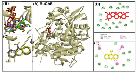Superimposed image of docked ligands in the active site of BuChE (PDB ID: 4BDS). (A) The catalytic active site contains all docked ligands (native ligand: grey; redocked ligand: yellow; Alpinetin: pink; Calycosin: golden; HuperzineA: blue; Hydroxytyrosol: green; Soyasapogenol B: red). (B) A zoomed-in image of all docked ligands. (C) A zoomed-in image of the native ligand is superimposed over the redocked native ligand. (D) Molecular interaction study of Soyasapogenol B with amino acid residues. (E) Molecular interaction study of a redocked native ligand with amino acid residues. Reprinted from [227]. Copyright © 2022 by the authors and Licensee MDPI, Basel, Switzerland, distributed under the Creative Commons Attribution (CC BY) license (https://creativecommons.org/licenses/by/4.0/).