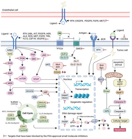 The Food and Drug Administration of the United States has approved small-molecule inhibitors that target cancer and the processes that cause it. Small-molecule inhibitors that have been approved by the Food and Drug Administration in the United States target a wide range of functions, such as nuclear transport, blood vessels, apoptosis, DNA transcription, DNA damage repair, cell surface receptors, signaling pathways, and epigenetic modifications. Reprinted from [238], Copyright, © 2022 by the Authors. MedComm is published by Sichuan International Medical Exchange & Promotion Association (SCIMEA) and John Wiley & Sons Australia, Ltd., under the terms of the http://creativecommons.org/licenses/by/4.0/.