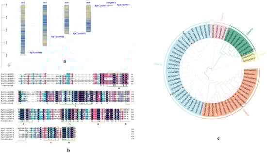 (a) Distribution of the PgCCoAOMT gene in P. grandiflorus genome. (b) Multiple sequence alignment results of five PgCCoAOMT proteins. The orange frame represents the common conserved sequences A, B, and C of plant methyltransferase; the green frame represents the tag sequences D, E, F, G, and H that are unique to the CCoAOMT gene family. The positions of highly conserved amino acids are marked with letters at the bottom. (c) Phylogenetic tree of members of the CCoAOMT gene family in 10 different plants. The red pentagram represents members of the PgCCoAOMT gene family.