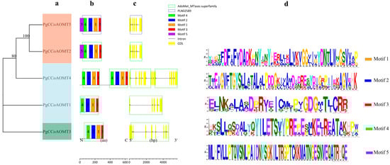 (a) Phylogenetic analysis, (b) protein motif, (c) gene structures, (d) display of the conserved motif sequence of the CCoAOMT gene family in P. grandiflorus.