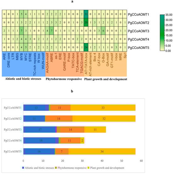 Analysis of cis-regulatory elements in the promoter region of the CCoAOMT gene of P. grandiflorus. (a) The horizontal coordinate represents different cis-regulatory elements, the vertical coordinate is the CCoAOMT gene, and the middle number represents the number of cis-regulatory elements. The larger the number, the higher the frequency of occurrence and the darker the green color. (b) It is a stacked bar chart, with blue representing elements related to environmental stress, orange representing elements related to hormonal response, and yellow representing elements related to growth and development.