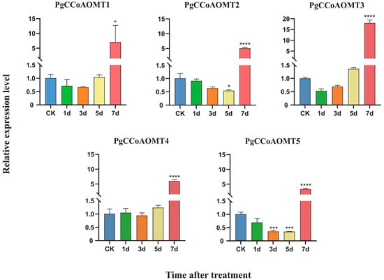 qRT-PCR analysis of five PgCCoAOMT genes under copper stress. One-way analysis of variance (ANOVA) was used to analyze the significance of copper stress treatment for 1 d, 3 d, 5 d, 7 d, and CK samples (* p < 0.05, *** p < 0.001, **** p < 0.0001).