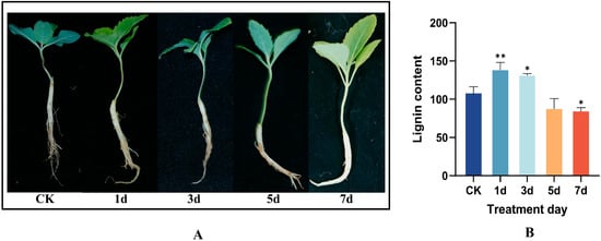 Characterization of P. grandiflorus seedlings under copper stress (1 d, 3 d, 5 d, 7 d were treated days) (A) and the changing trend of lignin content (B). (* p < 0.05, ** p < 0.01).